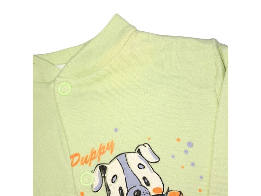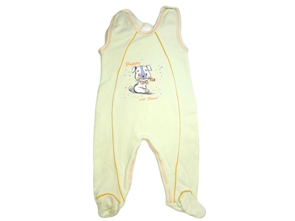 Halvány sárga pamut kardigán és ujjatlan rugdalózó szett, kutyás mintával.