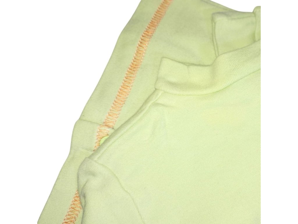 Tökéletlenségeik, hogy a kardigán nyakánál halvány elszíneződés található (talán mosható), illetve a rugdalózó jobb talpán egy nagyon pici öltés.