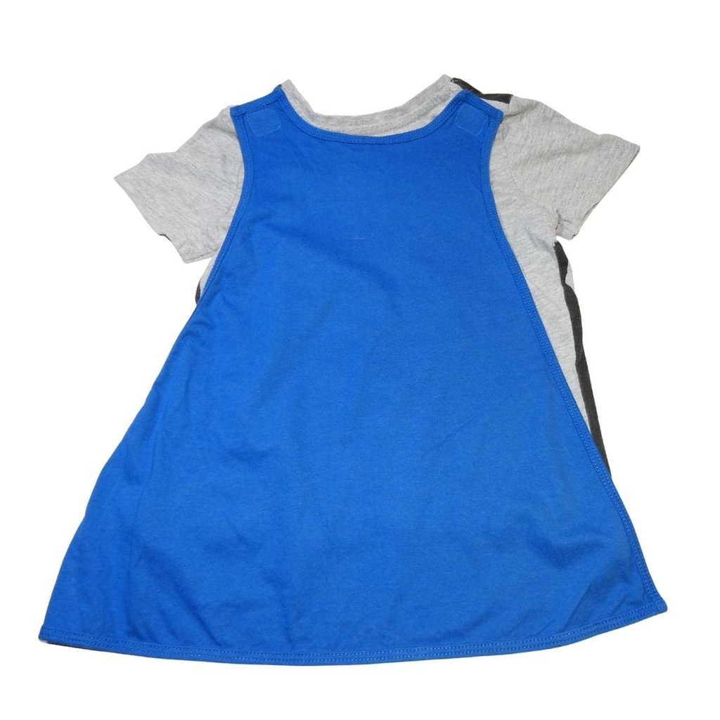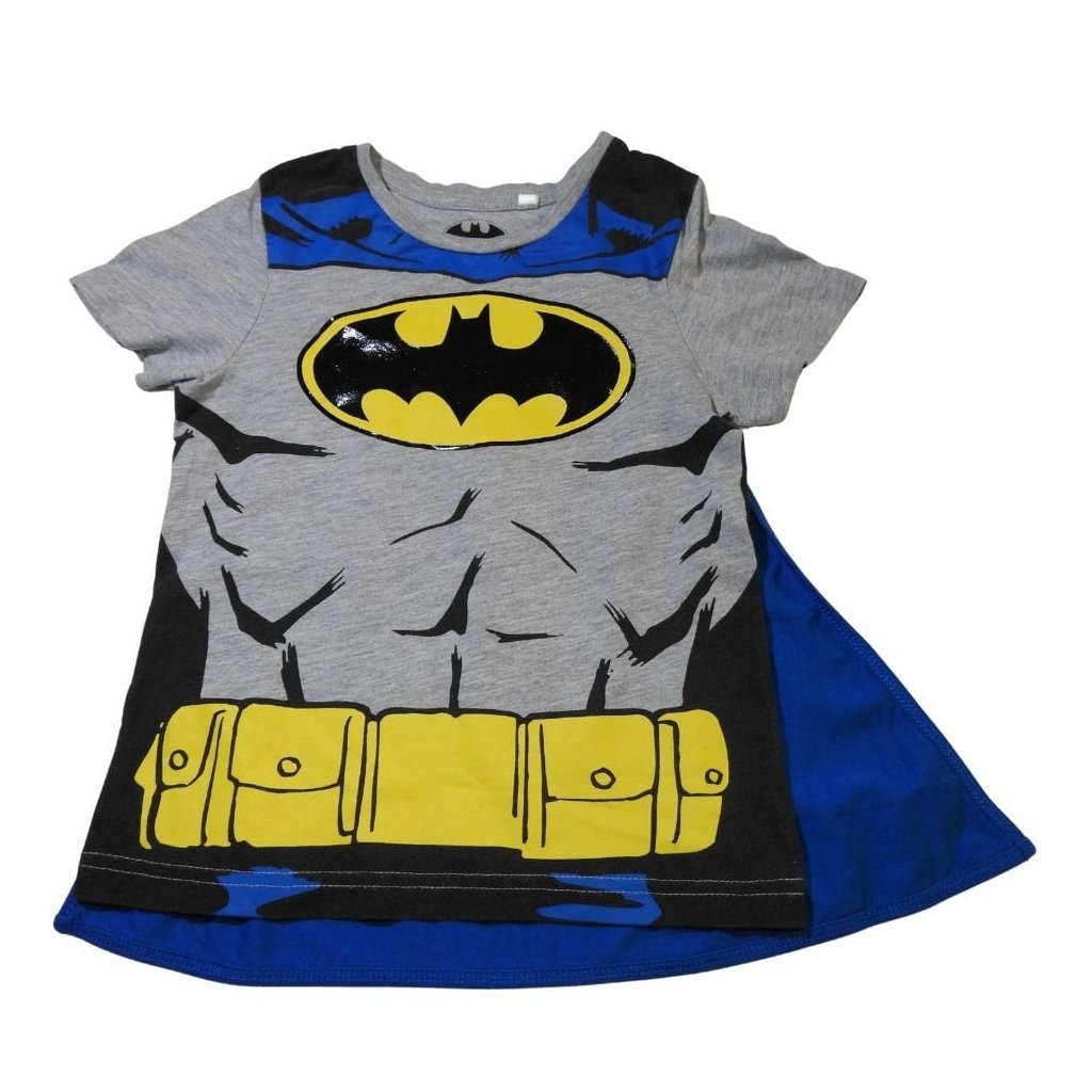 Szürke, rövid ujjú pamut póló nyomott mintával, kék köpennyel.