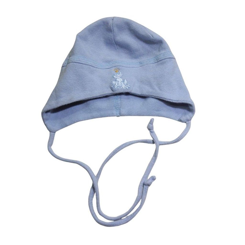 Világoskék pamut sapka, hímzett béka mintával, megkötővel.