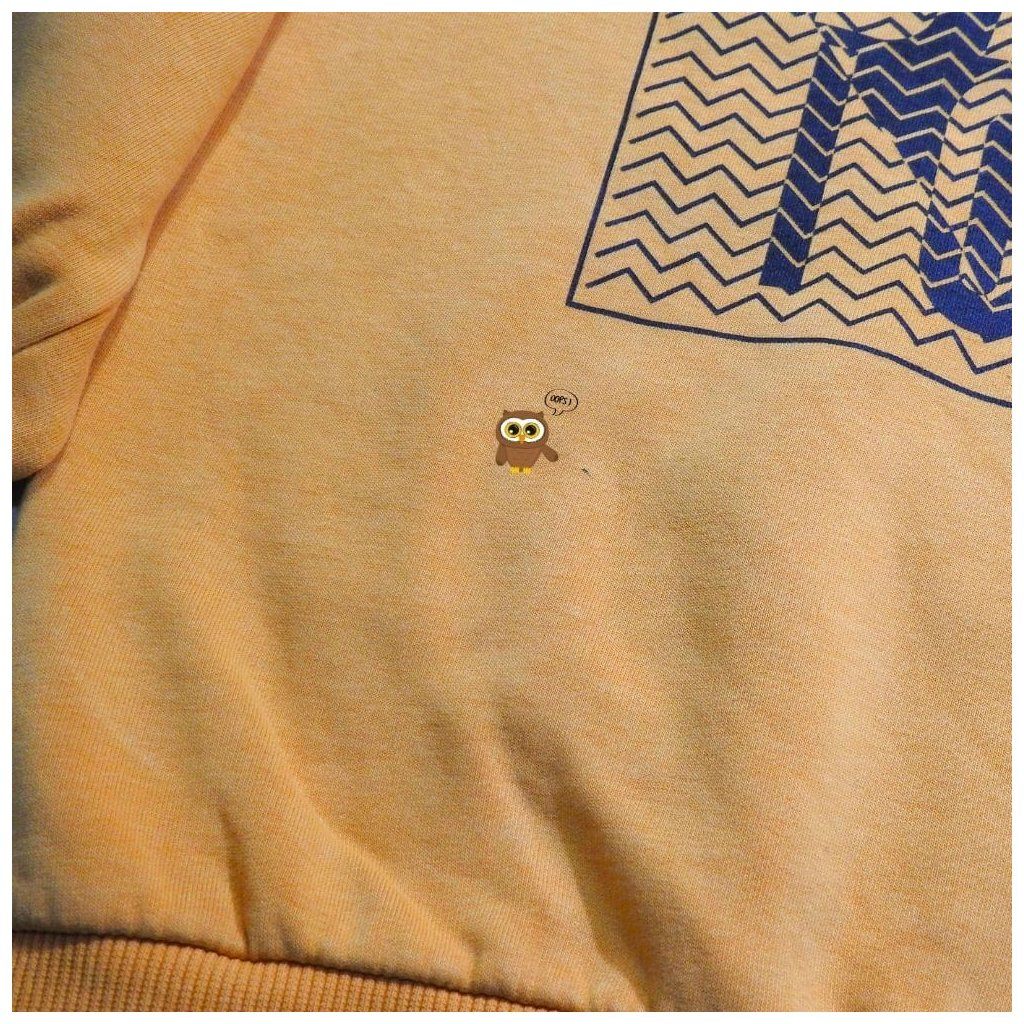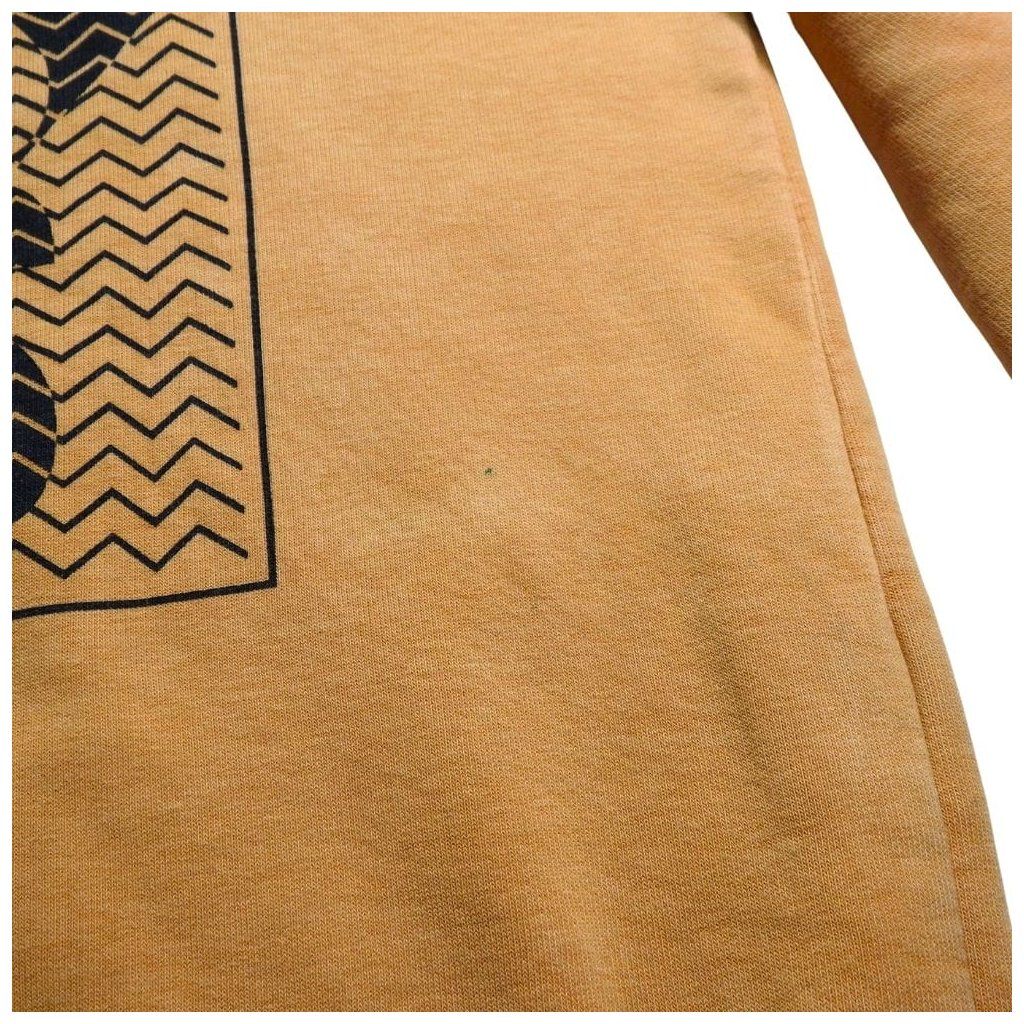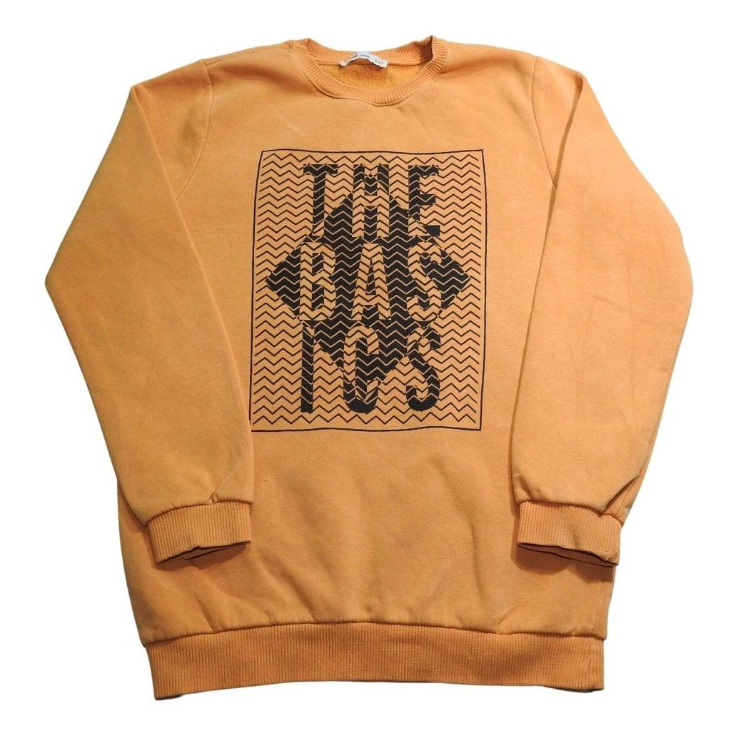 Narancssárga pulóver, középen fekete mintával/felirattal.