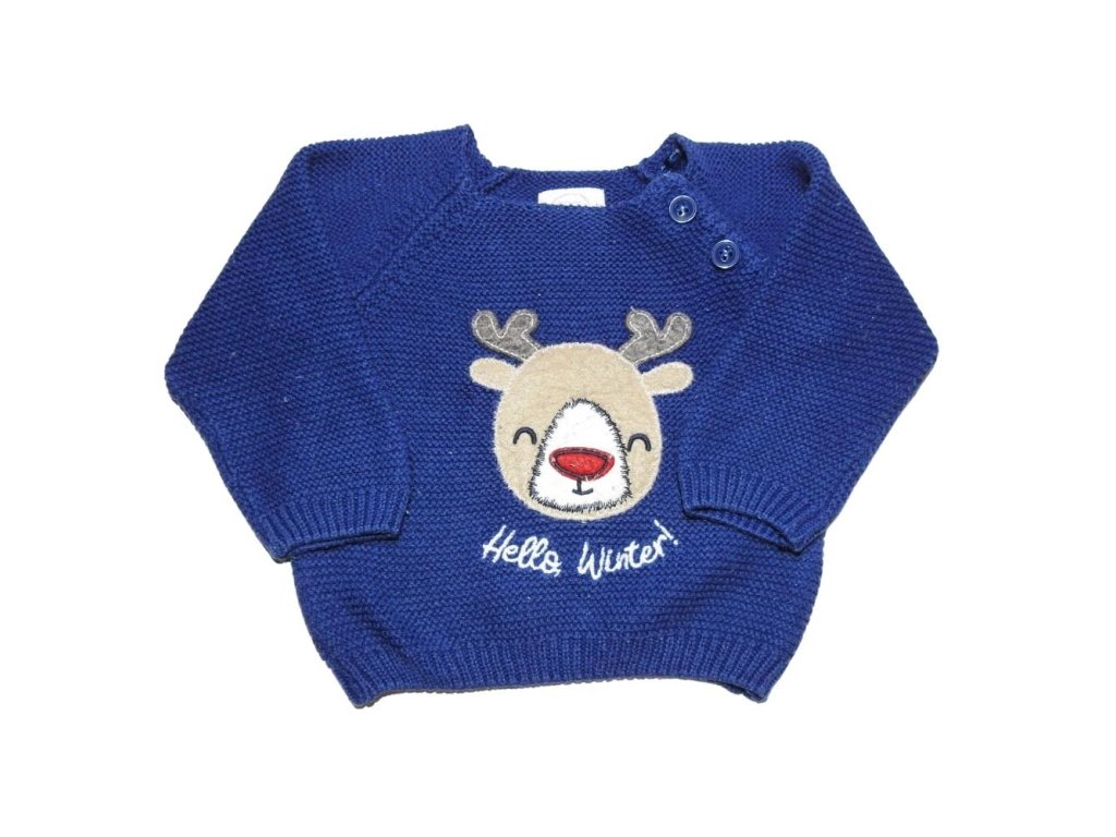 Kék, kötött (karácsonyi) pulóver hímzett rénszarvas mintával.