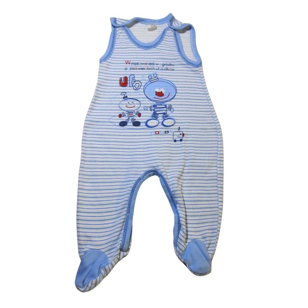 Fehér-világoskék csíkos, ujjatlan pamut rugdalózó mintával.