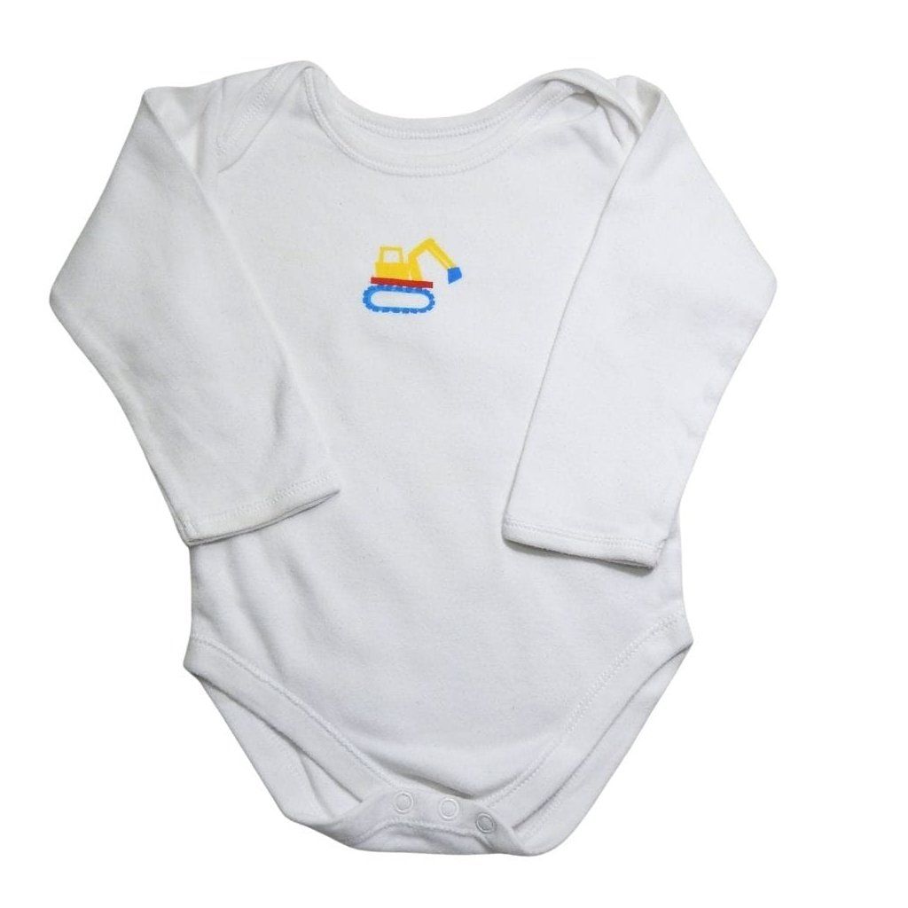 Fehér, hosszú ujjú pamut body markolós/munkagépes mintával.