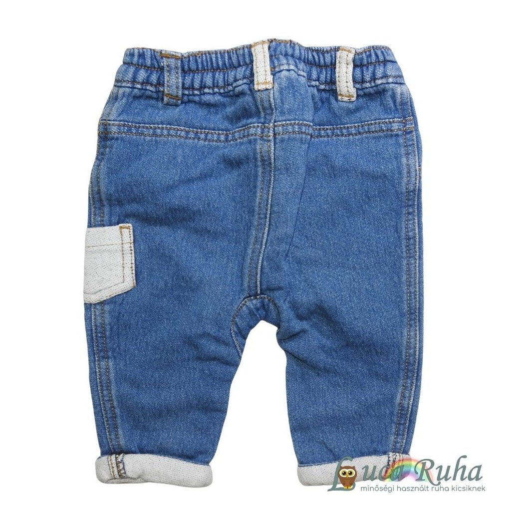 Kék, koptatott stílusú, oldalzsebes, gumis derekú farmernadrág.
