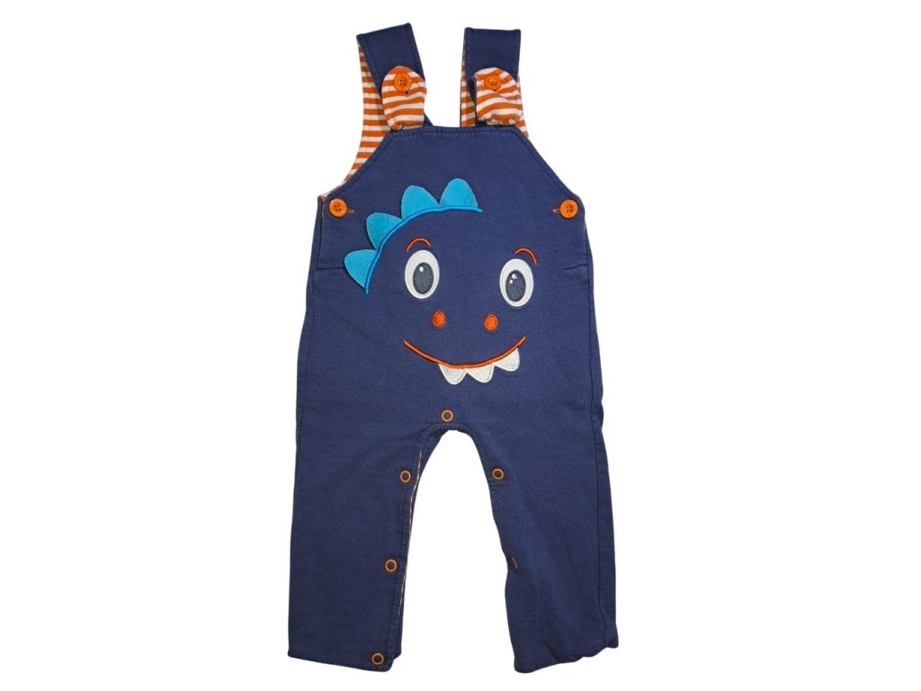 Sötétkék, vastagabb anyagú kantáros overál/rugdalózó, dinós mintával, patentos záródással a lábszárak között.