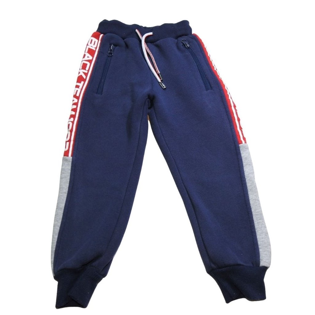 Sötétkék, pamut melegítőnadrág oldalán piros-szürke csíkkal, felirattal.