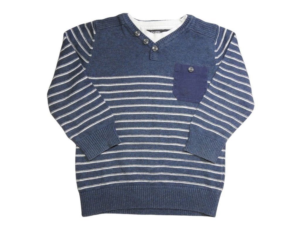 Kék-fehér csíkos, kötött pulóver mellzsebbel.