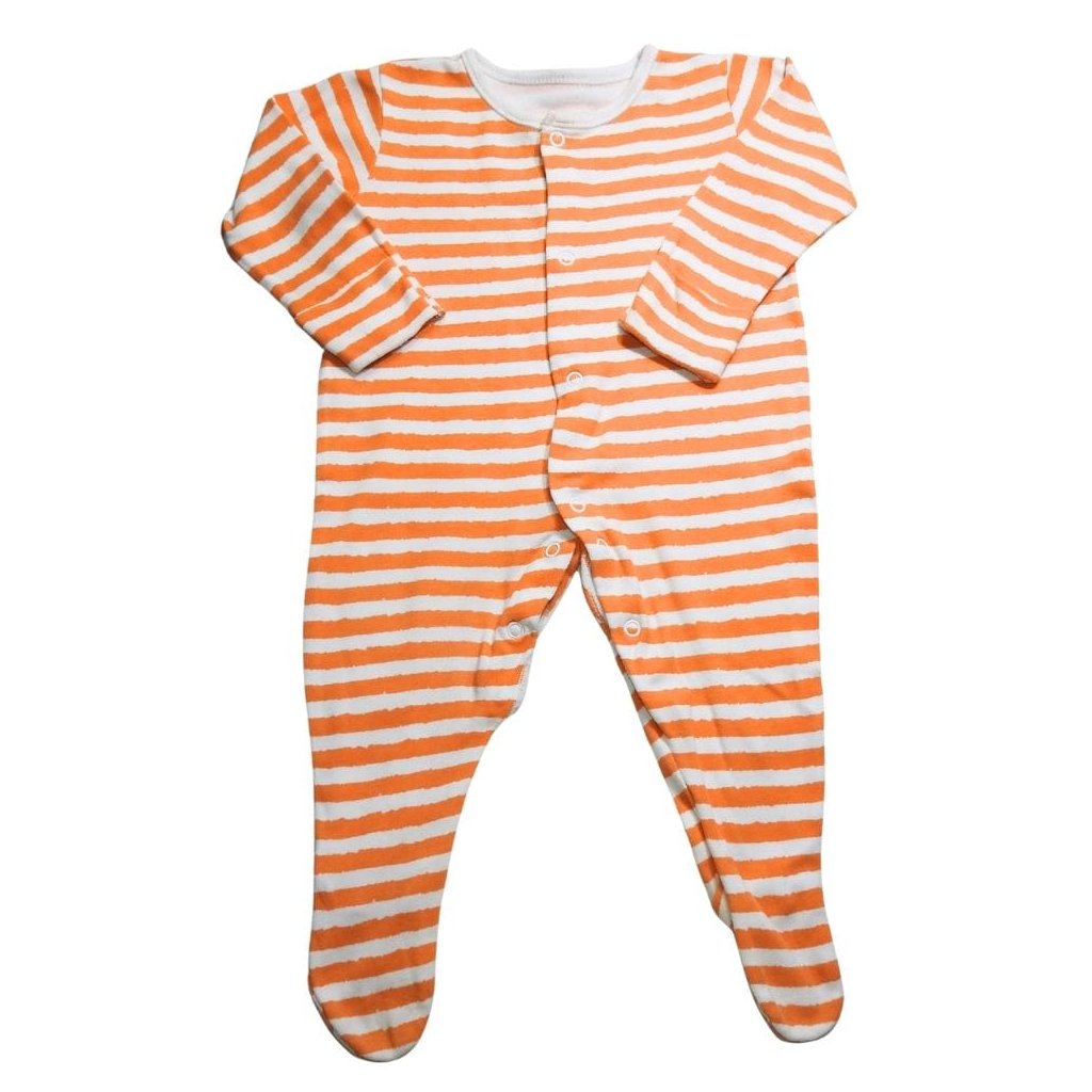 Narancs-fehér, lábfejes, pamut rugdalózó, ujjai kesztyűként lehajthatóak.
