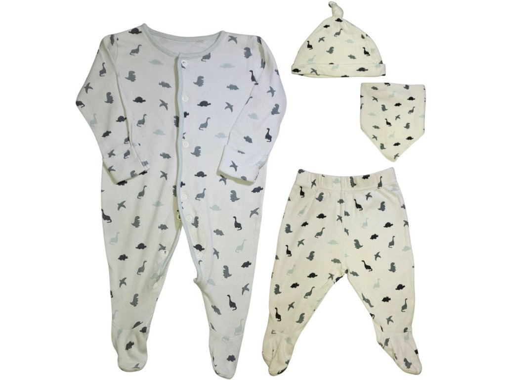 A szett tartalmaz egy rugdalózót, talpas nadrágot, nyálkendőt és sapkát