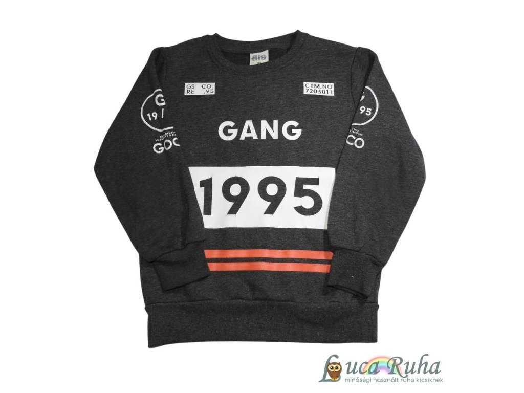 Sötétszürke pulóver, nyomott feliratokkal, mintával.