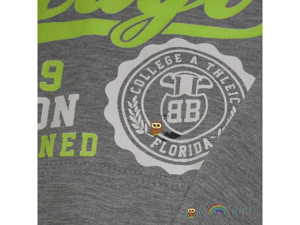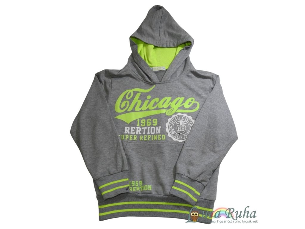 Szürke-zöld, kapucnis pulóver kenguruzsebbel, felirattal.