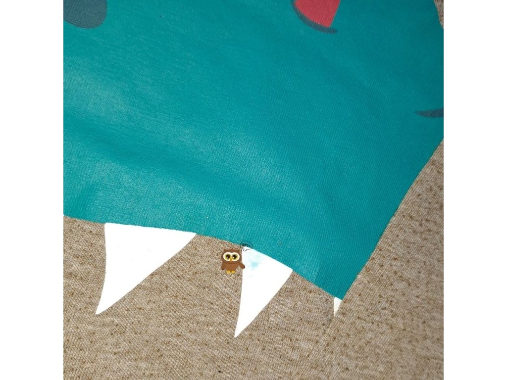 Tökéletlensége, hogy a mintán és a jobb ujj végén is találhatóak kék foltok, illetve a mintázat repedezett, anyaga bolyhos.