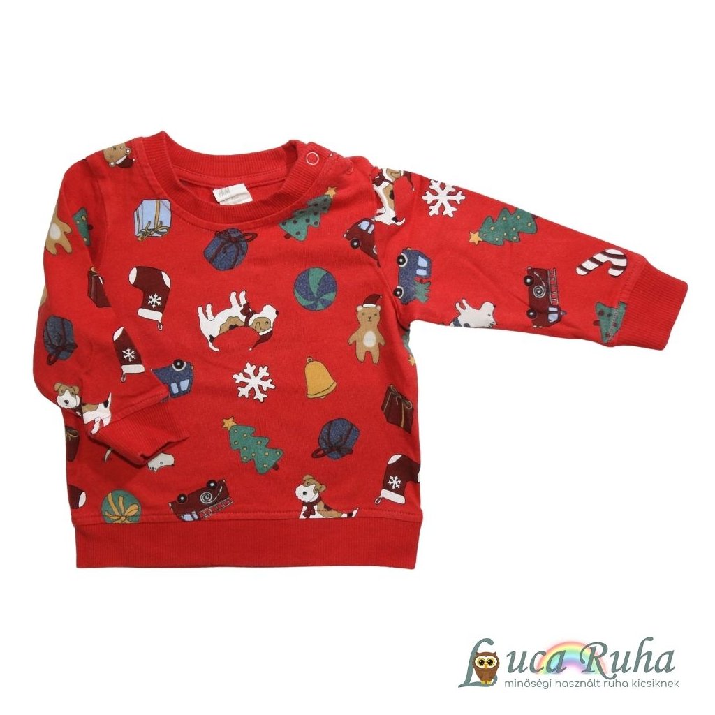 Piros pamut pulóver karácsonyi mintákkal.
