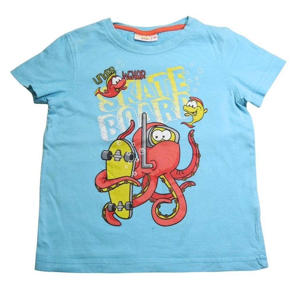 Világoskék, rövid ujjú póló halas és gördeszkás polip mintával.