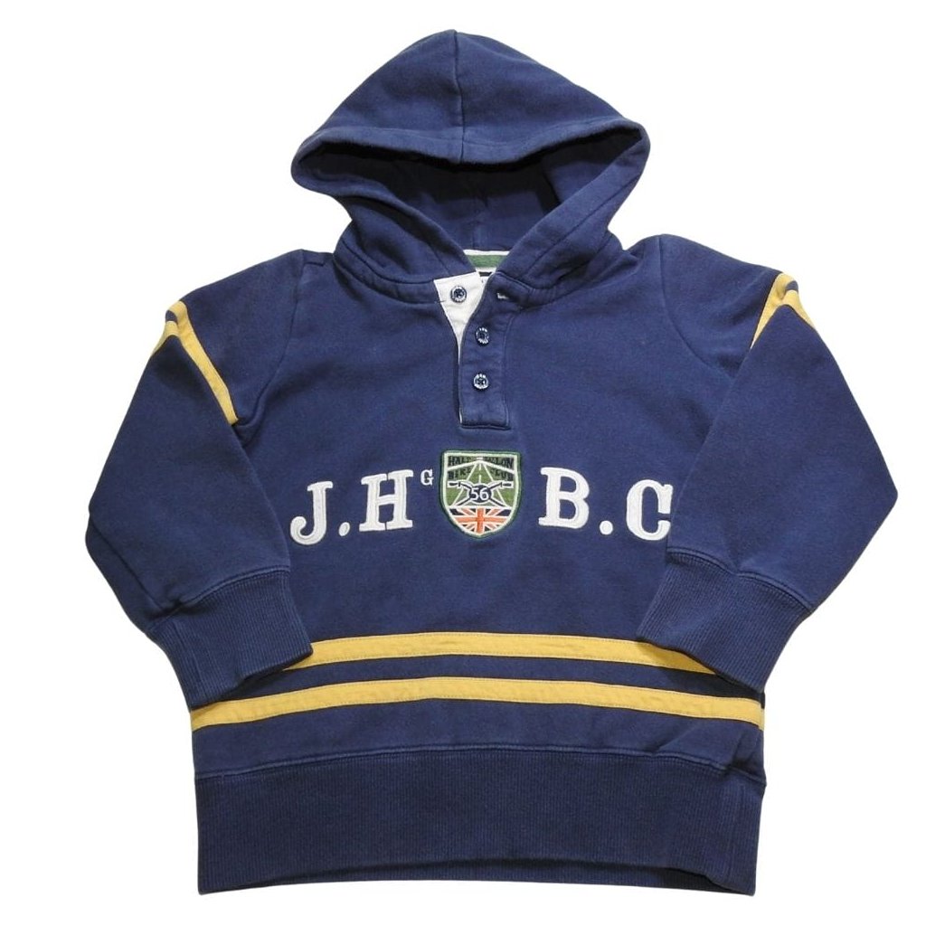Sötétkék, rugbi stílusú kapucnis pulóver, hímzett címerrel és rátétekkel.