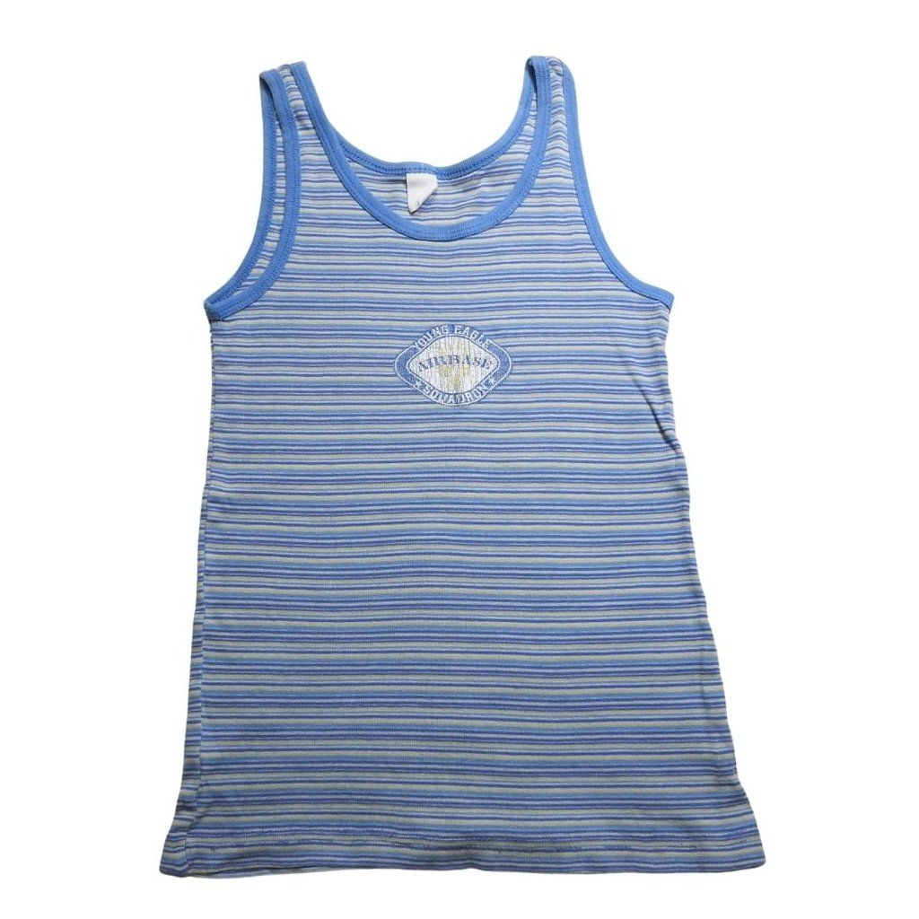 Világoskék-bézs, vékony csíkos trikó középen mintával.