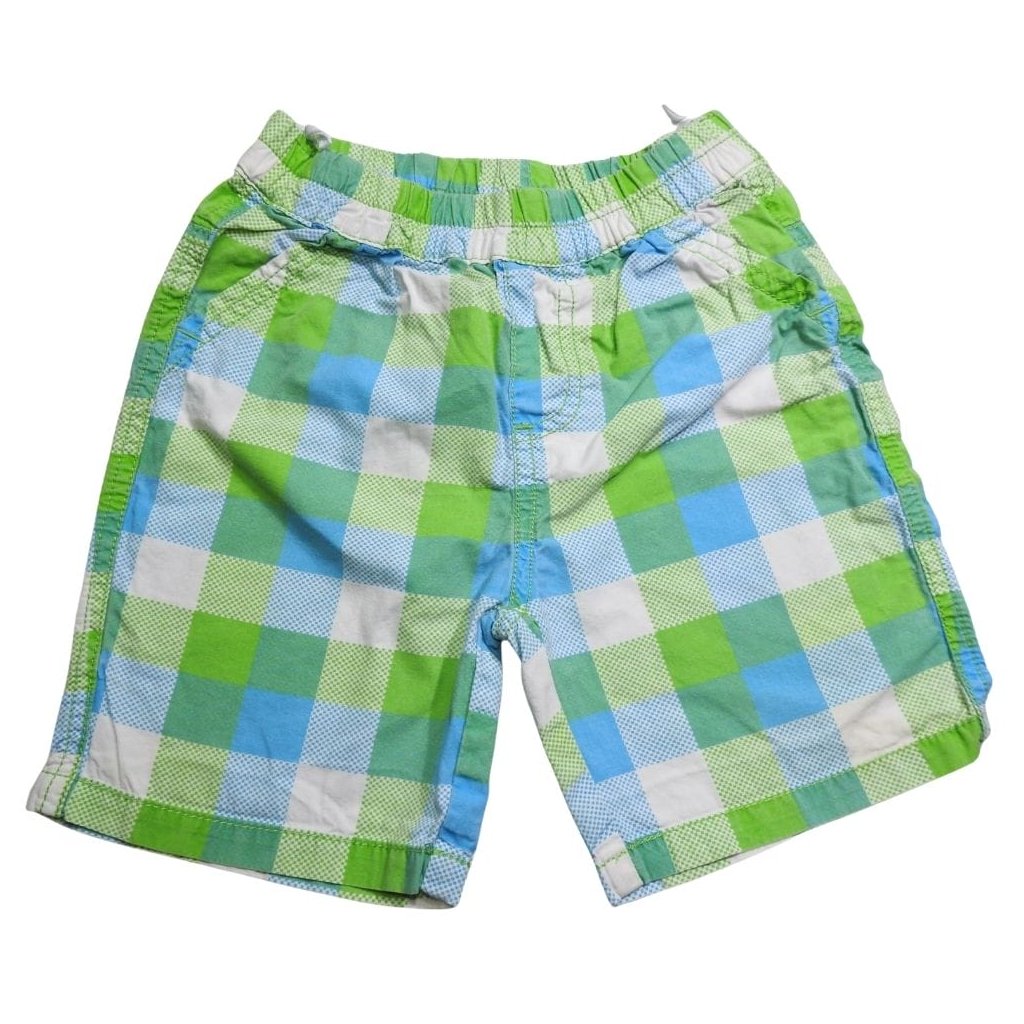 Világoszöld-fehér-világoskék kockás, gumis derekú, pamut rövidnadrág.