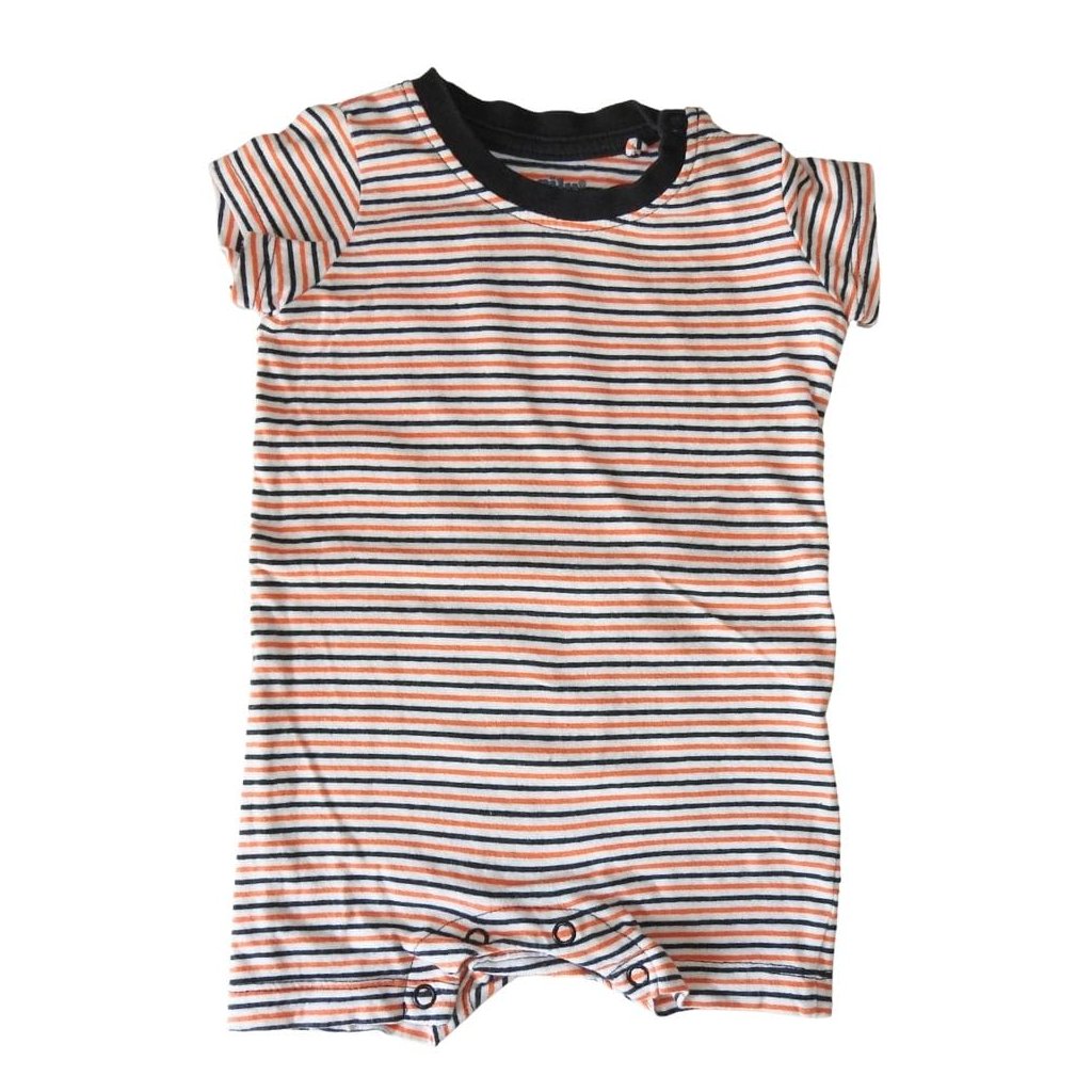 Sötétkék-narancs-fehér csíkos, rövid ujjú pamut napozó.