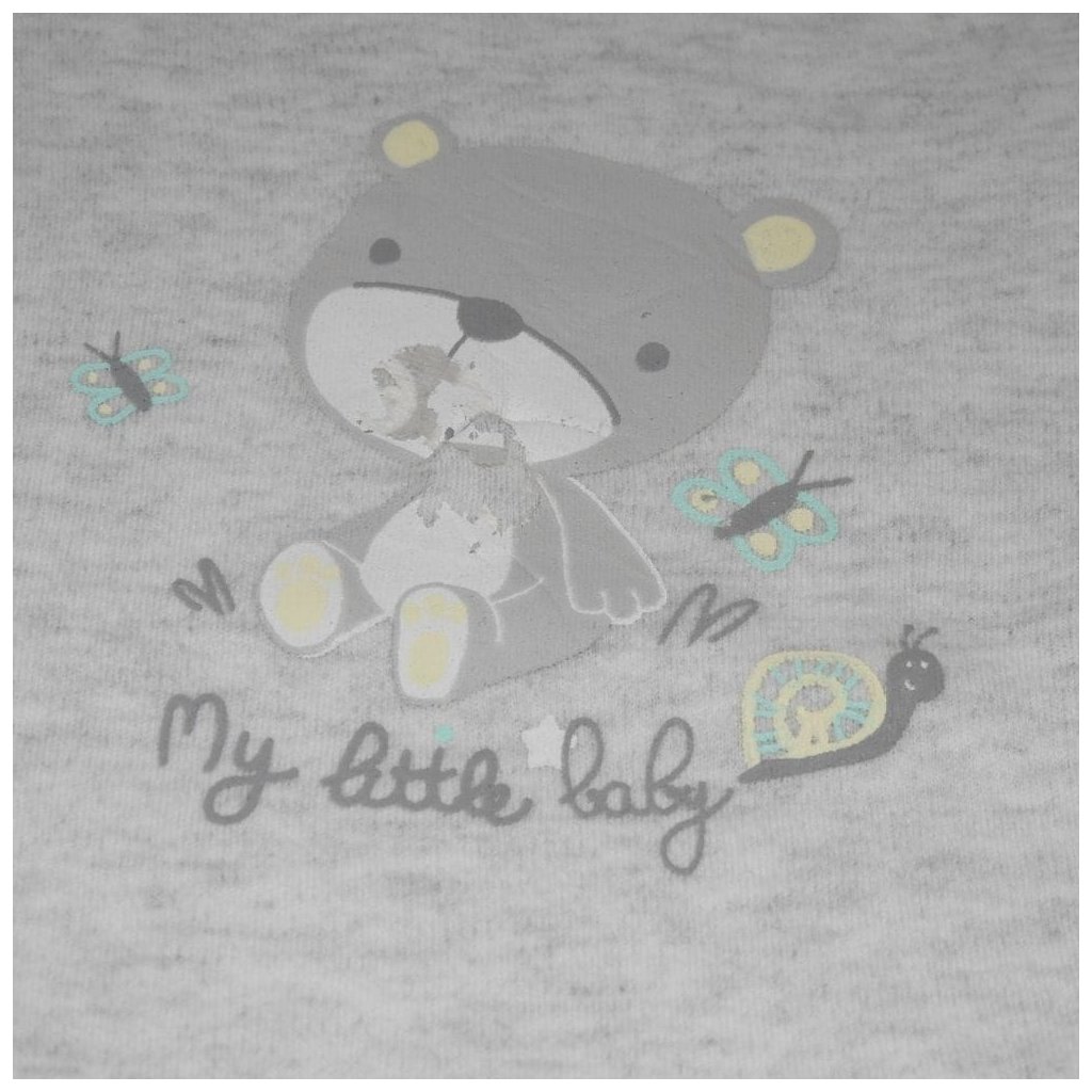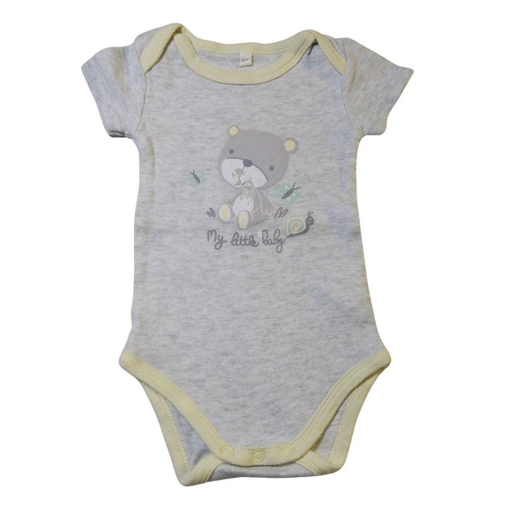 Szürke, rövid ujjú pamut body, halvány sárga szegéllyel, macis mintával.
