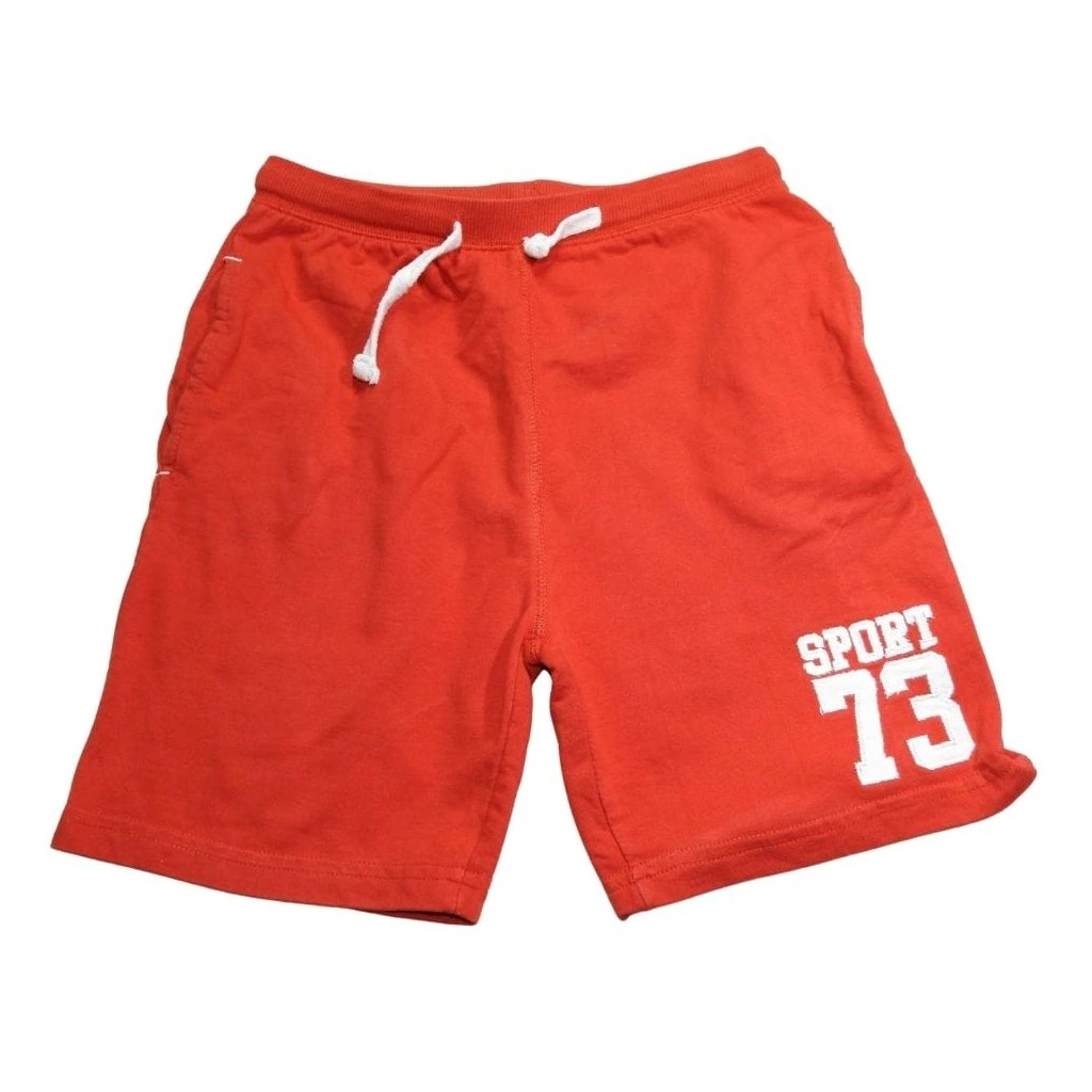 Piros, gumis derekú pamut rövidnadrág, bal szárán hímzett SPORT felirattal és számmal.