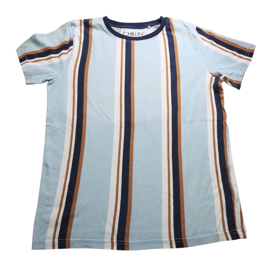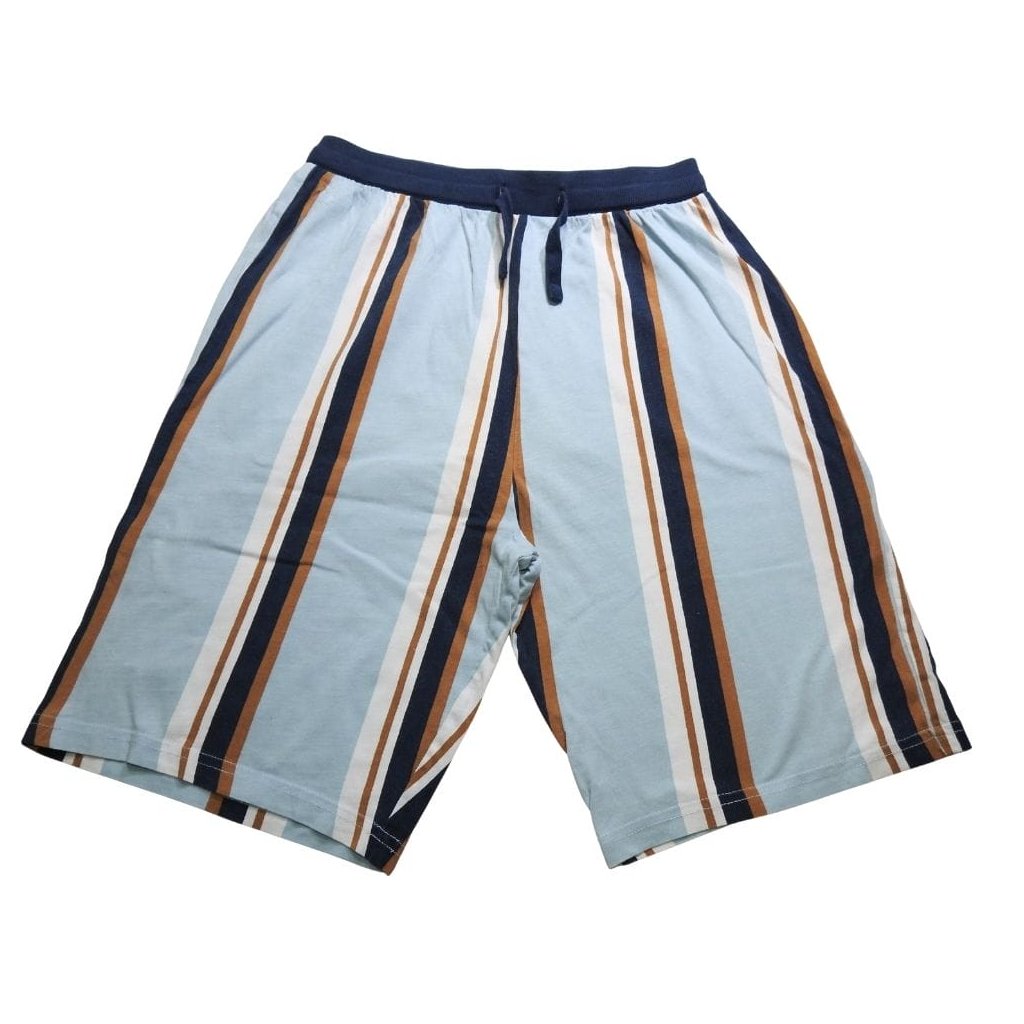 Világoskék, csíkos rövid ujjú pamut pólóból és rövidnadrágból álló pizsama együttes.