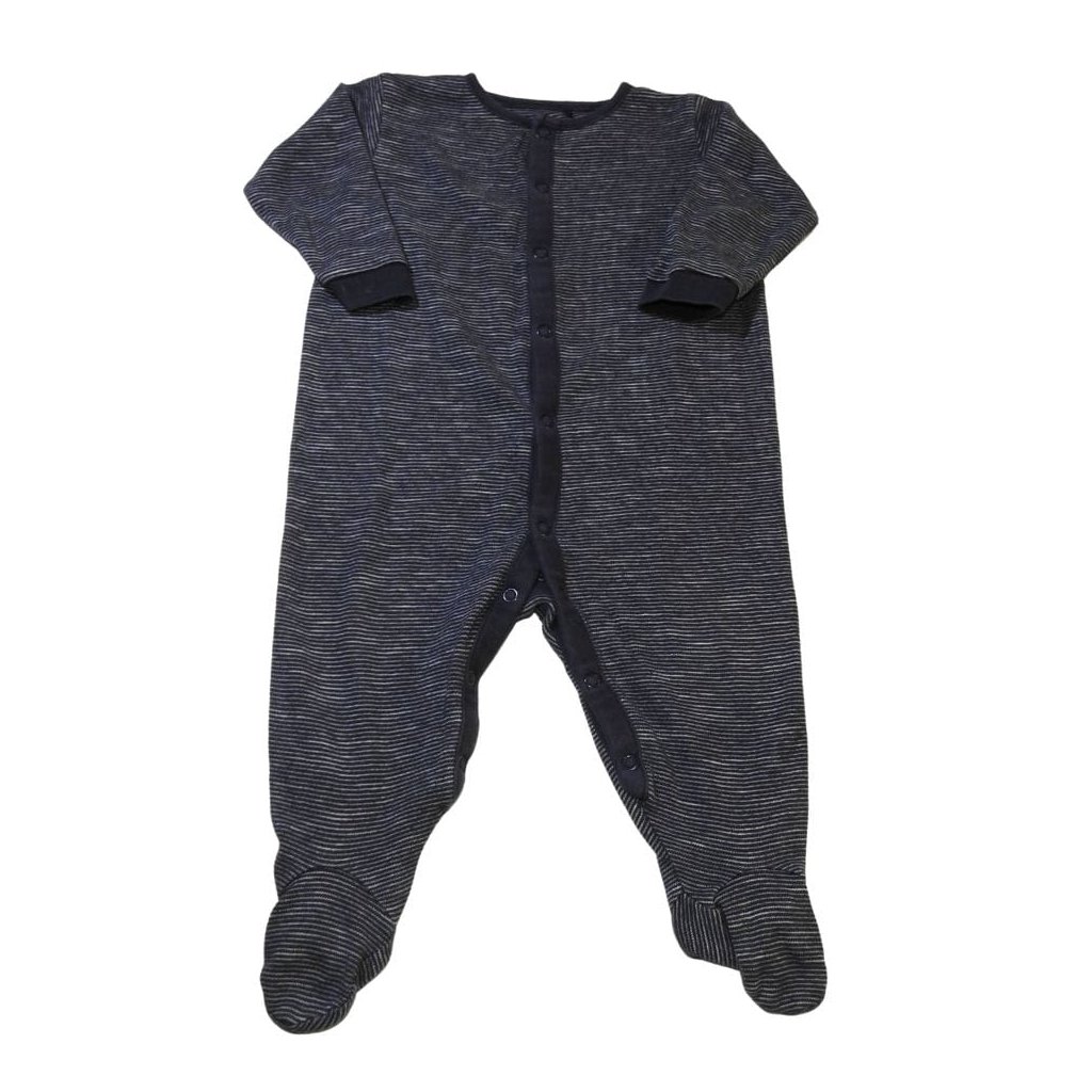 Sötétkék, hosszú ujjú pamut rugdalózó csíkos mintázattal, patentos záródással.