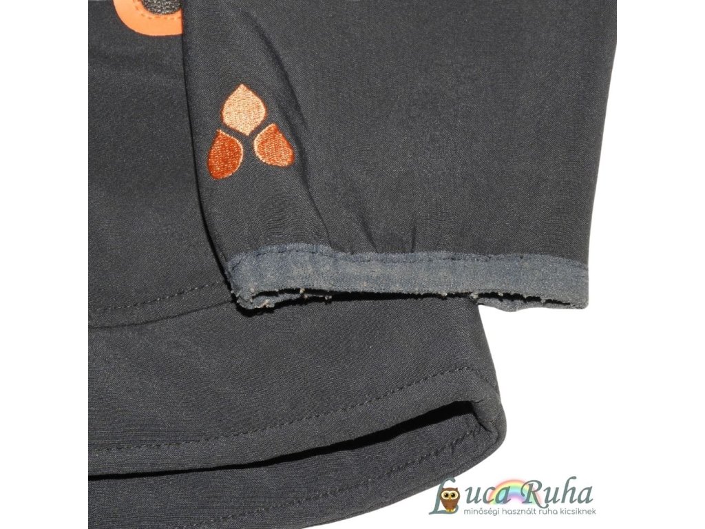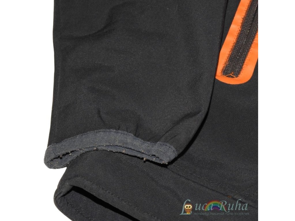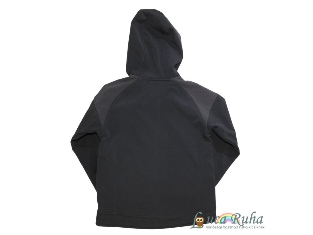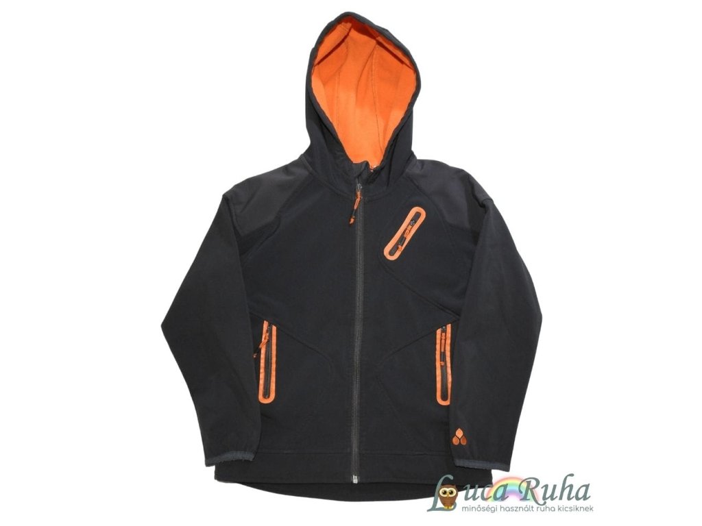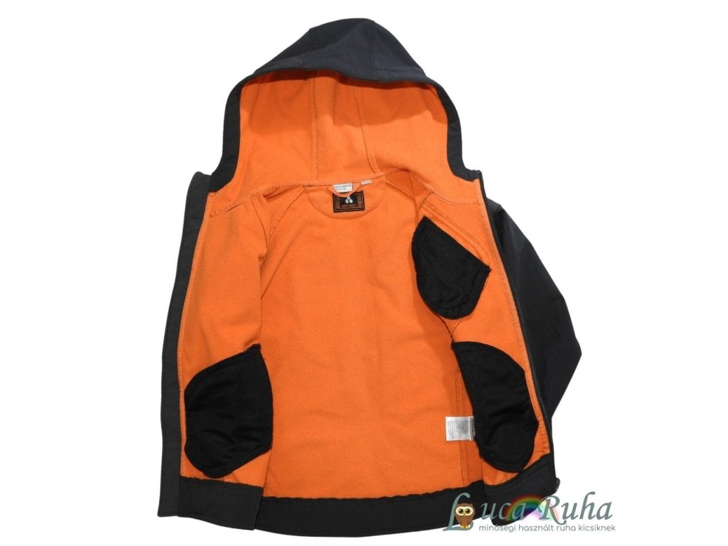Sötétszürke, bélelt softshell kabát, narancs részletekkel, kapucnival.