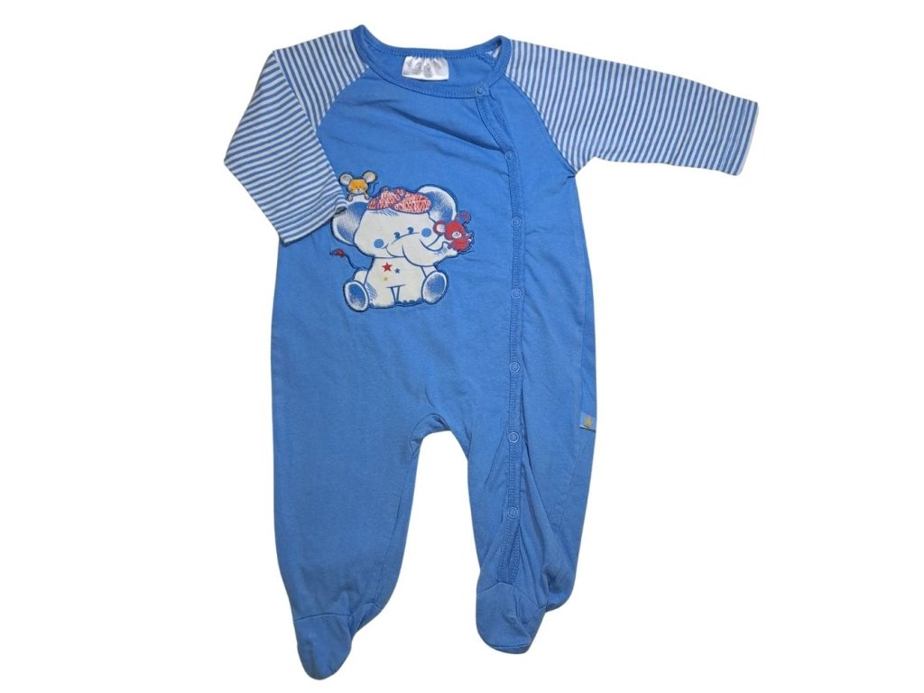 Kék, hosszú ujjú, talpas rugdalózó elefántos mintával.