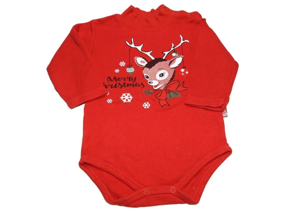 Piros, hosszú ujjú, magas nyakú, pamut body karácsonyi, rénszarvasos mintával, felirattal.