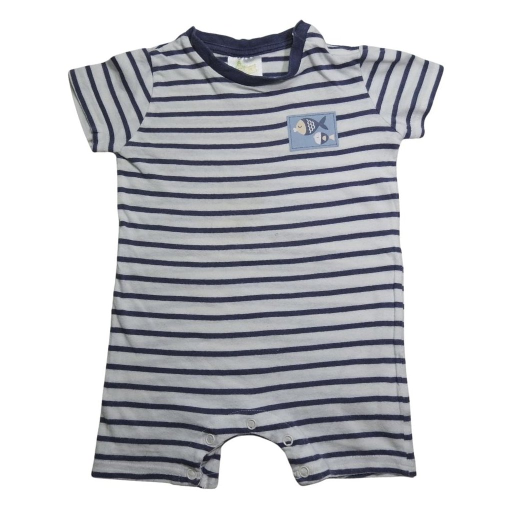 Fehér-kék csíkos, rövid ujjú napozó halas mintával.