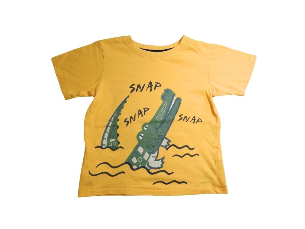Sárga, rövid ujjú pamut póló nyomott mintával.
