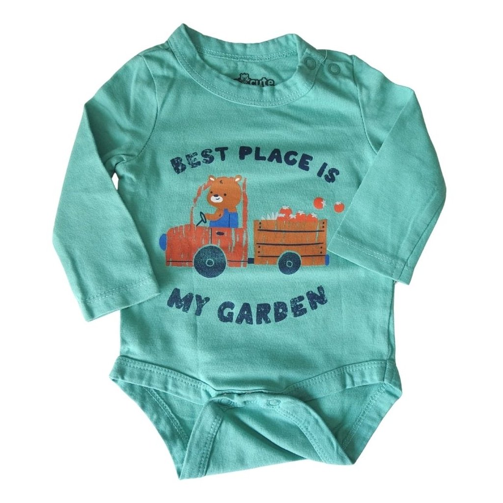 Zöld, hosszú ujjú pamut body macis mintával.