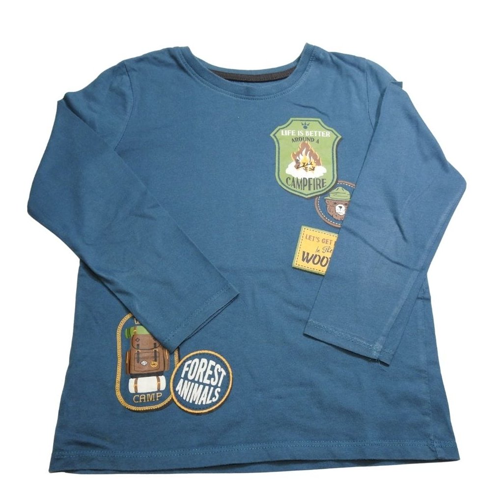 Petrol kék, hosszú ujjú póló, kempingezős, erdei témával.