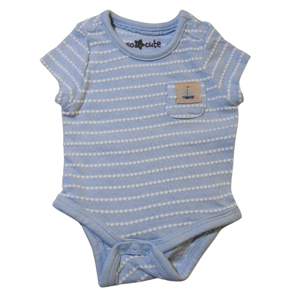Világoskék, rövid ujjú pamut, csíkos mintás body mellzsebbel, hajó mintával.