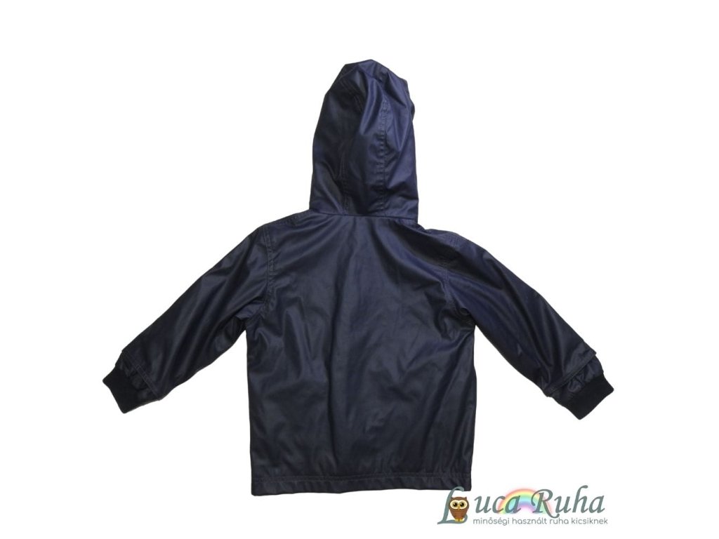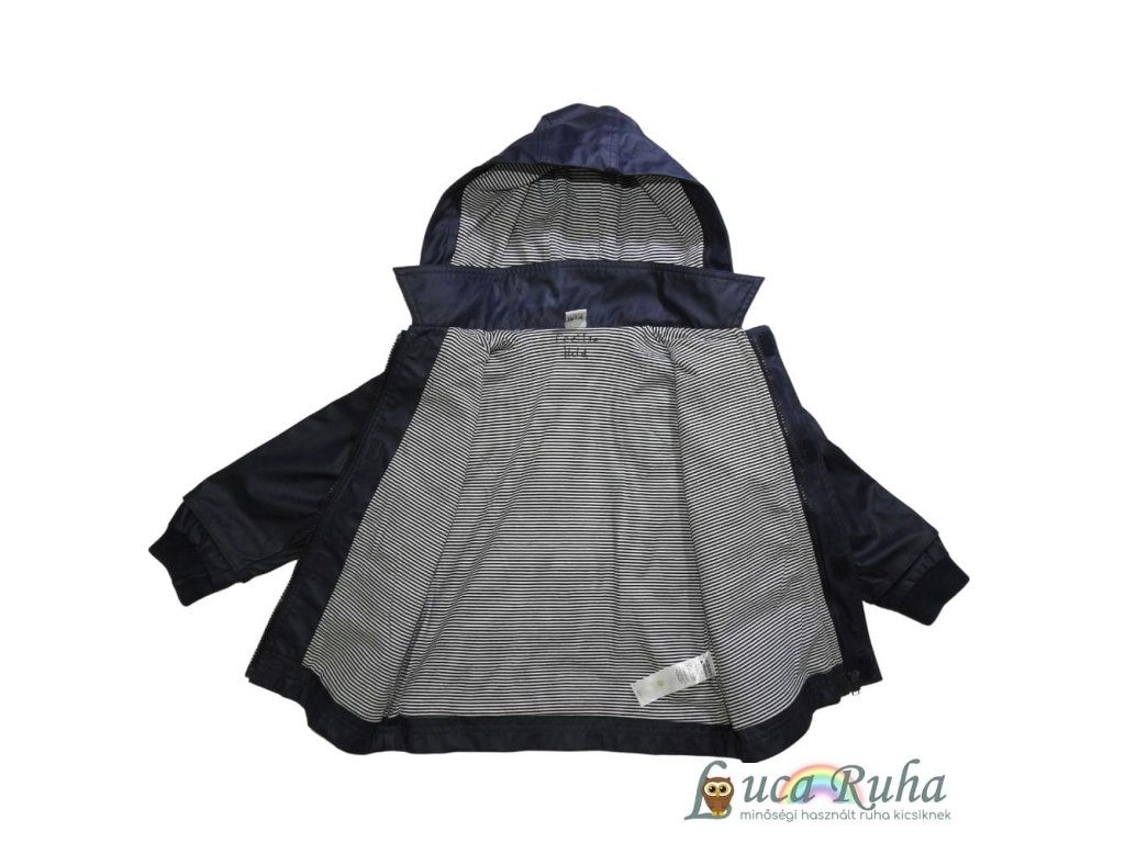 Sötétkék esőkabát, csíkos pamut belsővel, kapucnival.