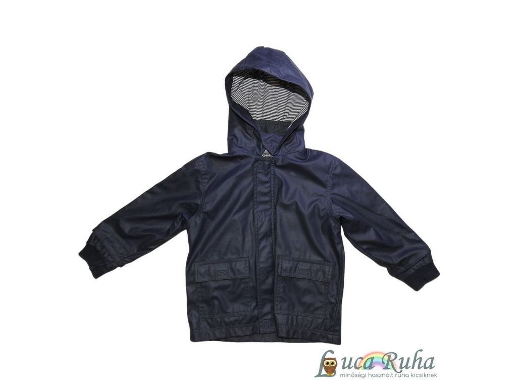Sötétkék esőkabát, csíkos belsővel, kapucnival.