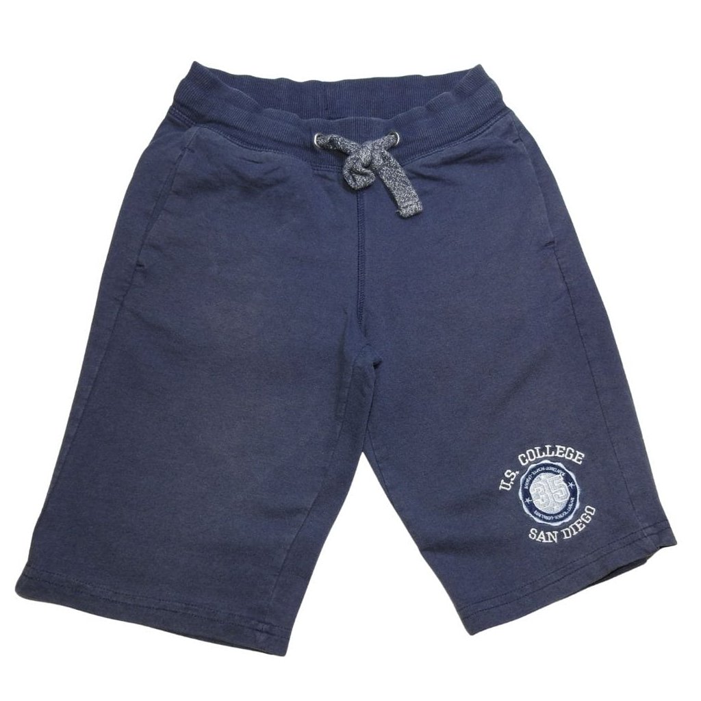 Sötétkék pamut rövidnadrág megkötővel, bal szárán mintával..