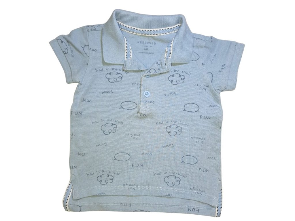 Kék, galléros, rövid ujjú pamut póló mintával.