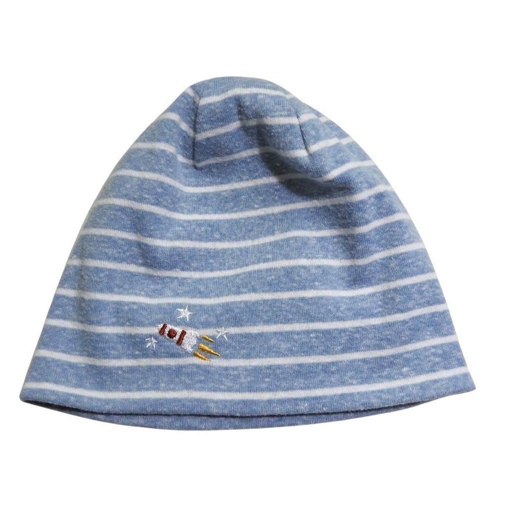 Világoskék, fehér csíkos, dupla rétegű pamut sapka, hímzett űrhajó mintával.