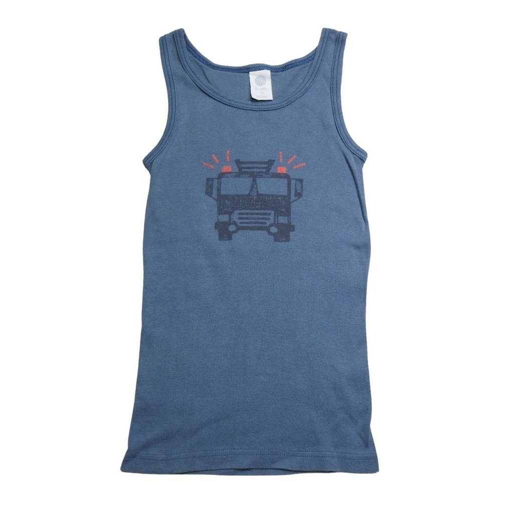 Kék pamut trikó tűzoltós mintával.