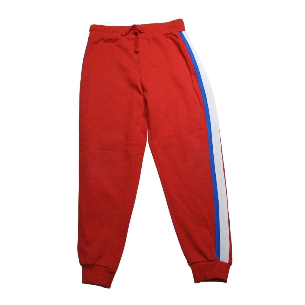 Piros melegítőnadrág, oldalán kék-fehér csíkkal.