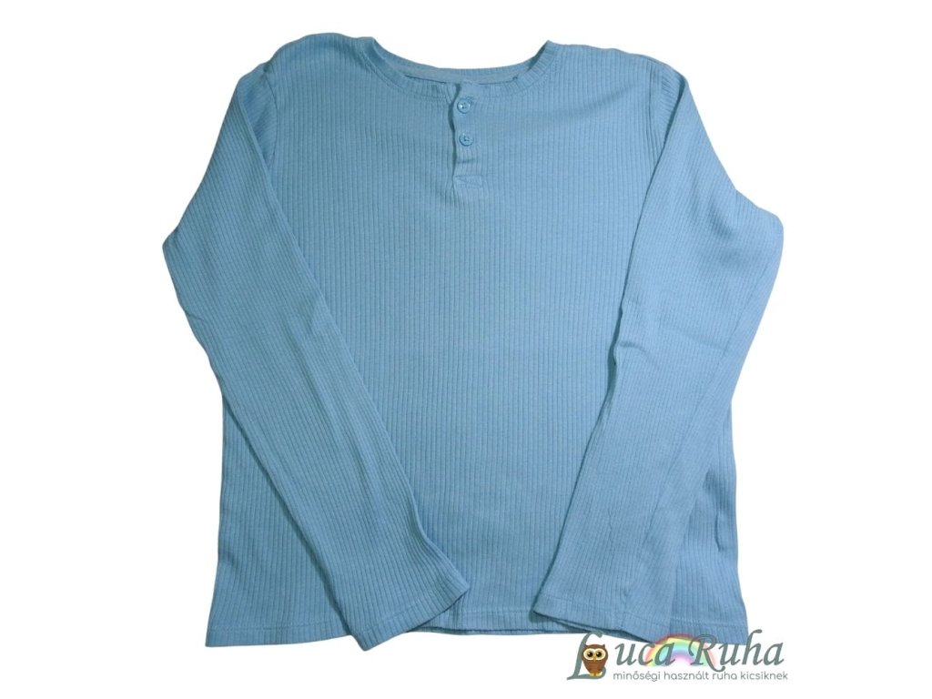Világoskék, hosszú ujjú, bordázott anyagú póló gombos nyakkal.
