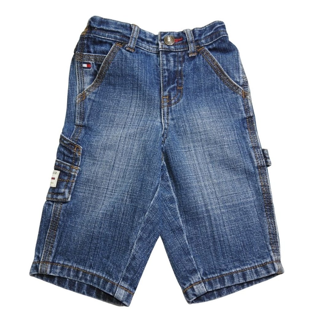 Kék, koptatott stílusú, menő, hosszú szárú kisfiú farmer "carpenter" (asztalos) stílusban, kalapácstartó pánttal és extra oldalzsebbel díszítve. Eredeti Tommy Hilfiger, jellegzetes hímzett zászló logóval a zseben és márkázott gombbal.