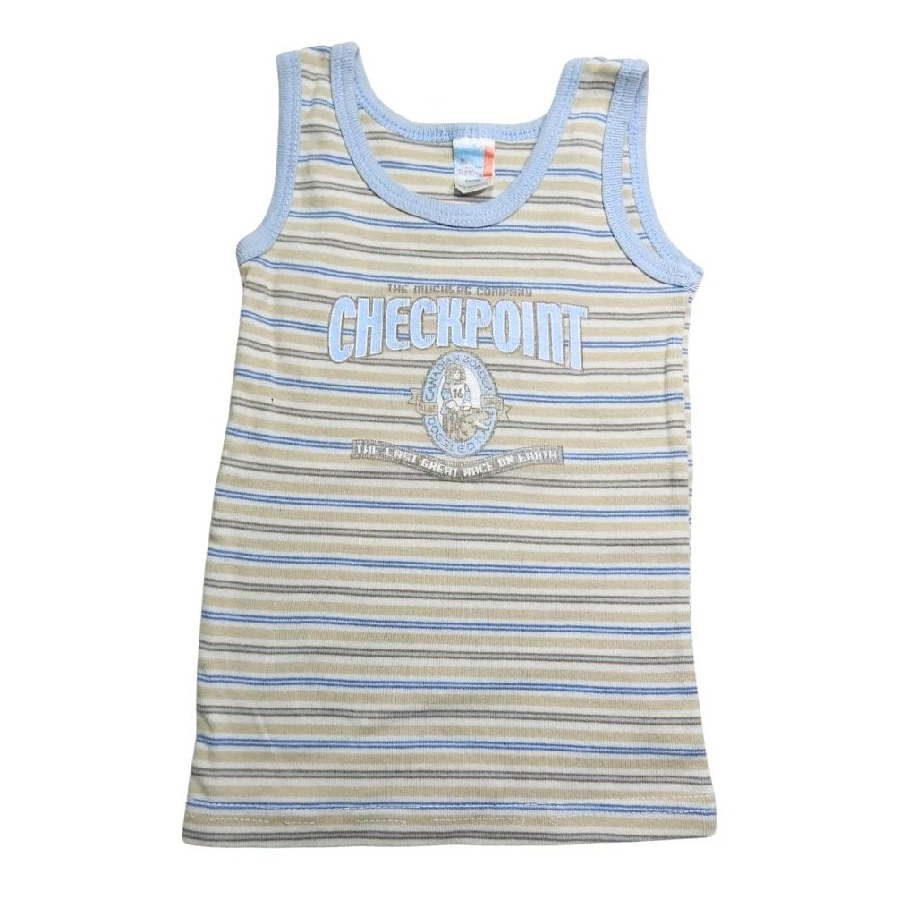 Világoskék-bézs-fehér-szürke csíkos pamut trikó felirattal és mintával.