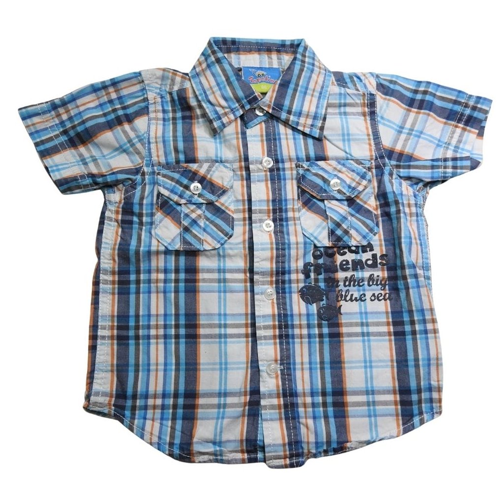 Kék-narancs-fehér színű kockás, rövid ujjú ing.