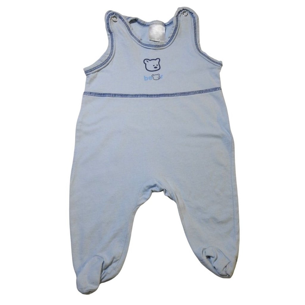 Világoskék, ujjatlan, vékony anyagú rugdalózó maci mintával.