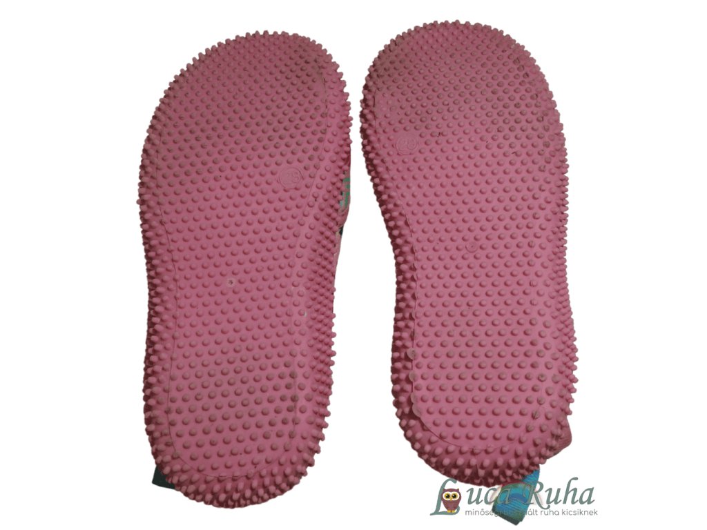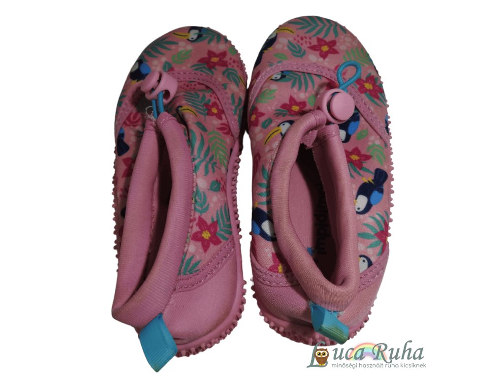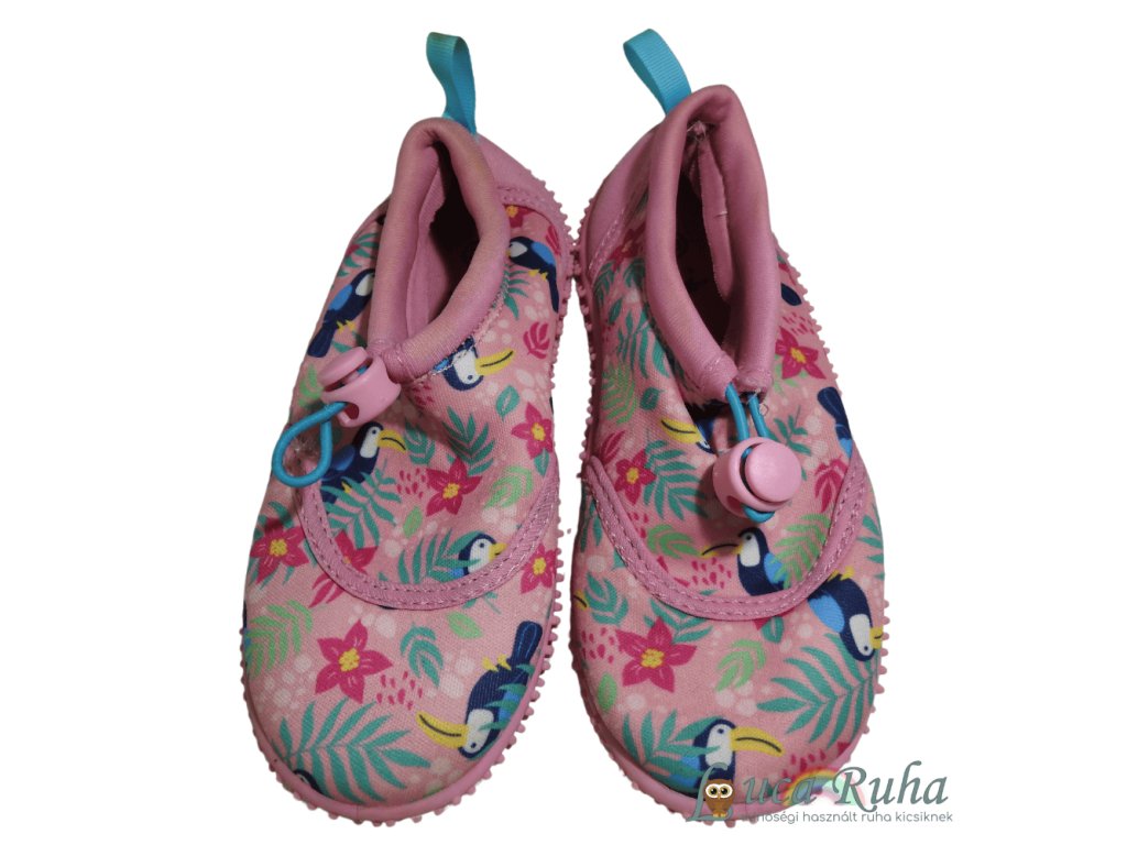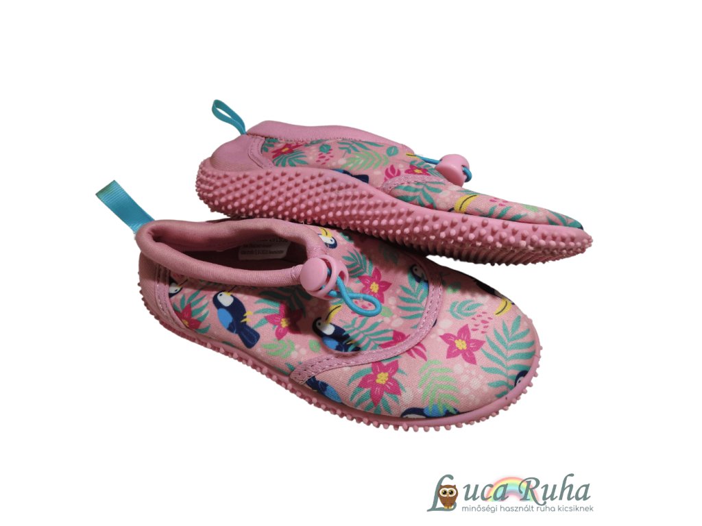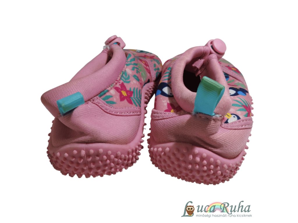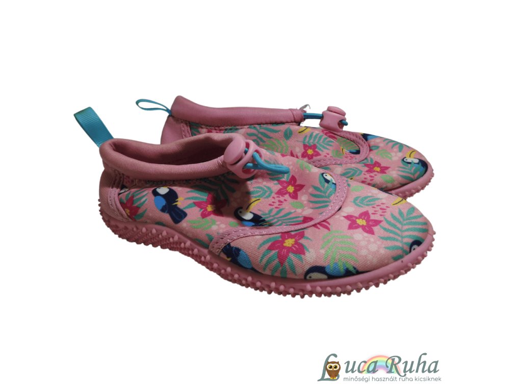 Rózsaszín, trópusi mintás vízicipő a képeken látható állapotban.