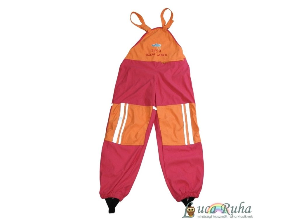 Pink-narancs esőnadrág fényvisszaverő csíkokkal, állítható kantárral.
