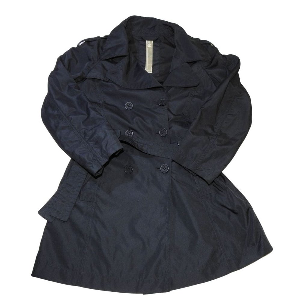 Sötétkék női ballonkabát gombos záródással, övvel.